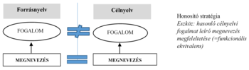A honosítás stratégiája mögött az a szándék húzódik meg, hogy a két fogalmi rendszer közötti hasonlóságot szeretnénk hangsúlyozni. Ennek érdekében egy olyan célnyelvi megfelelőt használunk, amely már létezik a célnyelvben, azaz amely már egy létező célnyelvi fogalmat jelöl. Ekkor lényegében nem is fordításról, hanem fordítói megfeleltetésről beszélhetünk (Klaudy 2007: 69). Nem véletlen, hogy e stratégia eredményeként alkalmazott ekvivalenseket a szakirodalom funkcionális ekvivalensnek nevezi, hiszen a célnyelvi ekvivalens ugyanazt a funkciót hivatott betölteni a célnyelvben, mint a forrásnyelvben – még akkor is, ha a két fogalmi rendszer között különbség van (a szakirodalomban használt megnevezésekről lásd részletesen a 3.1. alfejezetet). E stratégia alkalmazásával a célnyelvi olvasóban a saját („honi”) fogalmi rendszerének fogalmait hívjuk elő. Ezért vigyáznunk is kell: ha túl nagy a különbség a forrásnyelvi és a célnyelvi fogalom között, és mégis a honosítást alkalmazzuk, akkor az az olvasó számára félrevezető lehet.