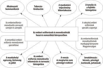 Az EEM egyébként szerteágazó hatókörének megjelenítéséhez gyakran használják azt a közelítést, amely a munkatársak szervezeti életciklusának főbb fázisait követi – a szervezetbe lépésüktől kezdve a munkatársként eltöltött időszakban történteken át a távozásukig tartó funkciókat megjelenítve. Az általunk követett koncepció szerint ezek az 1.1. ábra centrumából induló nyilak jelezte elemek: a toborzás–kiválasztás; a munkatársi teljesítmény kibontakoztatása; a javadalmazás: bérezés, pénzügyi ösztönzők, juttatások; a vonzás és megtartás nem pénzügyi eszközei; a tanulás és fejlődés támogatása; az alkalmazotti kommunikáció; a munkahelyi egészség, biztonság és jóllét; valamint az emberierőforrás-menedzselés információs és tervezési támogatása.