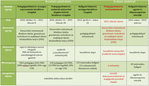 A pályán levő pedagógusok kvantitatív adatfelvétele során a magyarországi köznevelési intézményekből kialakított reprezentatív (N=5063), valamint szakértői mintán (N=220) valósult meg az adatfelvétel pedagógusokkal és intézményvezetőkkel. A kérdőív, melyet az esettanulmányokban részt vevő iskolák vezetői és pedagógusai is kitöltöttek, hét változócsoportot tartalmazott: