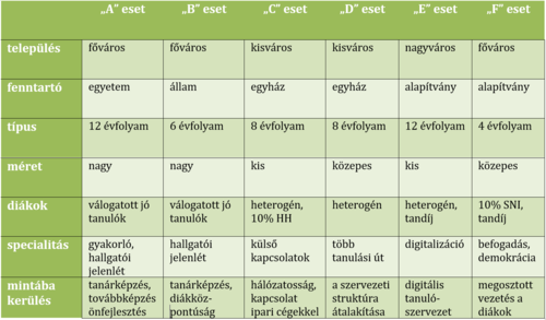 Az esettanulmányokhoz kiválasztott hat intézményt az alábbi szerkezetben, illetve szempontok szerint mutatjuk be: elhelyezkedés, fenntartó, típus, méret, szervezeti jellemzők, tanulók és a tanárok jellemzői, vezetés szerepe, a mintába kerülés oka, specialitás (2. táblázat). Az egyes eseteket az ábécé egyes nagybetűivel jelöltük, s az elemzésekben is e formát követjük majd.