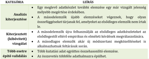 A fenti tipológia azt a három másodelemzés-típust azonosítja, amelyet Heaton (2008) is a legáltalánosabbnak vélt. A típusok „tiszta” megjelenésére és kombinációjára is találhatók példák a kutatásokban.