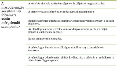 A másodelemzés rugalmassága mellett azonosítható egy olyan folyamat, amely tervezhetőbbé teszi az alkalmazását. Ezt több szerző is kiemeli, tipizálása alapján ismerteti (Heaton, 2008; Long-Sutehall et al., 2011; Anderson–Paulus, 2021). A folyamatleírások szintetizálható elemei az alábbiak: