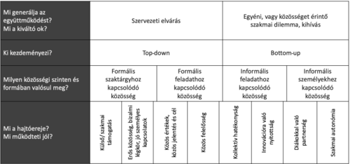 Az eredményes tanulási helyzetek jellemzéséhez mátrixot készítettünk, amelyben a kiemelt tanulási helyzethez kötődő tanulási folyamatok dinamikájának sajátosságait (kiindulópont, kiterjedtség stb.) összekapcsoltuk Hargreaves és O’Connor (2018) kollaboratív szakmaiság modelljének – az esettanulmányok szövege alapján releváns elemzési szempontként kiemelt – jellemzőivel. A mátrixban minden intézményi példa kapcsán rögzítettük azt, hogy: a) mi generálta az együttműködésre épülő tanulást (szervezeti elvárás vagy egyéni/közösséget érintő szakmai dilemma), b) ki kezdeményezte (top-down vagy bottom-up), c) milyen közösségi szinten és formában valósult meg, d) és hogy mi működteti jól, mitől eredményes (kollaboratív szakmaiság jellemzők összekapcsolódása).