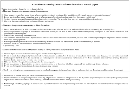 A useful approach to awareness raising is self-correction or peer-editing (e.g., Mulligan & Garofalo, 2011). Based on the typical errors and problems regarding reference in novice writing that we found at Stage 5 of this research, it is possible to design a checklist that may be used by students to check their own written assignments (Figure 27). First, as a reading task, students may be asked to go through the checklist with a research article; second, they could use it as a guide in peer-editing and assessment, then, as a self-assessment tool. Familiarity with what needs more attention should help them make intelligent choices in their own writing process.