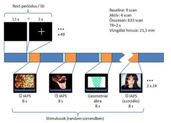 A kísérleti paradigmát úgy alakítottuk ki, hogy kétféle kísérleti szakaszt határoztunk meg: emocionális (aktív 1) és nem-emocionális helyzeteket (aktív 2). Az IAPS-képeket és a geometriai ábrákat a kísérleti szakaszokban (aktív 1 és aktív 2) alkalmaztuk, míg alapszintként (baseline) egy fekete háttér jelent meg. Három másodperccel az aktív szakaszok előtt egy fehér célkereszt hívta fel az alanyok figyelmét a közelgő ingerre. A paradigmában felváltva szerepeltek aktív és nyugalmi (baseline) szakaszok, ahol a különböző vizuális ingereket (képeket és geometriai ábrákat) megjelenítő kísérleti szakaszok random módon követték egymást. A vizsgálat összesen 97 szakaszból állt: 24 aktív 1, 24 aktív 2 és 49 baseline. A vizsgálati elrendezést a 31. ábrán láthatjuk.