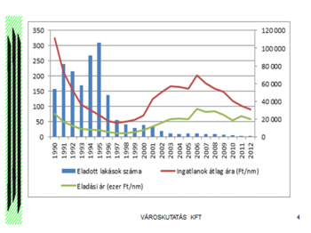 | 12 | Egy későbbi becslés szerint 1994-ben csak a fővárosban 300 Mrd Ft, az éves GDP 7%-ának megfelelő összeg volt ez a hátralék. A bérlakás-privatizációnak ez a vetülete 1994-ben drámai módon került reflektorfénybe, amikor két évvel a privatizáció után összeomlott egy százéves lakóház a budapesti Ó utca 24-ben. Az egy emberéletet is követelő tragédiát azután politikai beállítottság szerint interpretálta a politika és a közvélemény. Volt, aki azt hangsúlyozta, hogy miért nem folyt normális karbantartás és felújítás a rendszerváltást megelőző 40 évben, míg mások azt tartották fontosnak hangsúlyozni, hogy az egykori bérházak új tulajdonosai képtelenek előteremteni a minimálisan szükséges javítási-felújítási forrásokat is. 1994 végén egyébként az Országgyűlés tovább könnyítette a bérlakások megvásárlását, így a következő évben, 1995-ben tetőzött a lakásvásárlási hullám. |