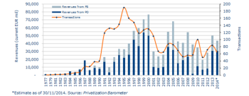 | 14 | Japánban 2015-re ígérték a sokszor elhalasztott postaprivatizáció beindítását, amitől 40 Mrd USD bevételt vártak. Végül csak egy ennél kisebb, 12 Mrd USD bevételt eredményező IPO-ra került sor november elején, amely a japán posta három alvállalatát érintette (Japan Post Holdings, Japan Post Bank, Japan Post Insurance). |