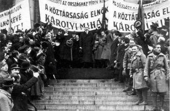 | 30 | Ezt a nevet használták 1919. március 21-ig, amikor is kikiáltották a Tanácsköztársaságot. Az akkor elfogadott ideiglenes alkotmány szerepét betöltő Néphatározat első cikke mondta ki azt, hogy „Magyarország minden más országtól független és önálló népköztársaság”. |
