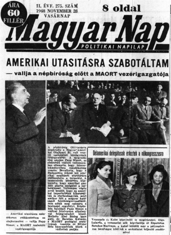 | 6 | 1945-re a vállalatnak külföldön befagyott követelései halmozódtak föl. Az államosított cég vezetői az illetékes, SZDP-irányítású minisztérium engedélyével utaztak Braziliába, illetve Svájcba. A vád szerint a kiutazók hadititkot adtak ki az ellenséges imperialista hatalmaknak. A vezérigazgatót, Szabó Kornélt halálra ítélték és kivégezték, három vádlott életfogytiglanit kapott. Politikai értelemben a célkeresztben azok a szociáldemokrata politikusok voltak, akik ellenezték az MKP és az SZDP fúzióját. |