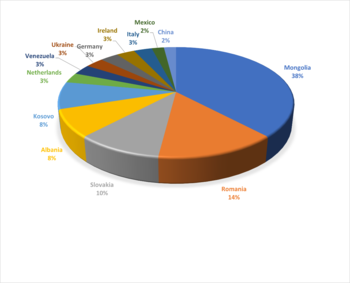 Figure 2 illustrates the nationality distribution of the 115 non-Hungarian children of the Székesfehérvár School District: Mongolia 38%, Romania 14%, Slovakia 10%, Albania 8%, Kosovo 8%, Netherlands 3%, Venezuela 3%, Ukraine 3%, Germany 3%, Ireland 3%, Italy 3%, Mexico 2%, China 2%.