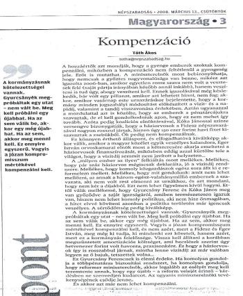 [1] A hozzáértők azt mondják, hogy a gyenge emberek szoktak kompenzálni, miközben a kompenzáció nem feltétlenül a gyengeség jele. [2] Erőt is mutathat. [3] A miniszterelnök most bebizonyíthatja, hogy nemcsak a győztes nagyvonalúsága van benne, miként azt igazolta 2006-ban, amikor egyetlen rossz szava nem volt a vesztesek felé (saját pártja irányában később annál inkább), hanem veszíteni is tud úgy, ahogy veszíteni kell. [4] Ennek igazolásával még késlekedik, bár volt egy pillanat, amikor azt lehetett hinni, nem fog: akkor, amikor vasárnap este urnazáráskor bejelentette, hogy a kormány minden jogszabályi módosítást előkészített a vizit- és a napidíj, valamint a tandíj visszavonása érdekében. [5] Aztán ugyanazzal a mozdulattal azt is közölte, hogy az emberek a pénztárcájukra szavaztak, de el kell gondolkodniuk azon, hogy ez nem mehet így tovább. [6] Azóta pedig koalíciós elnöktársával, Kóka Jánossal szinte versengve bizonygatják, hogy a háziorvosok a Fidesz népszavazásával nagyon rosszul jártak, hiszen úgy 150 ezer forint havi fixet kiszavaztak a zsebükből. [7] Ők pedig nem kompenzálnak.