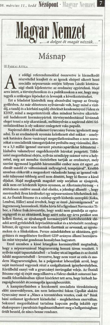 [13] Ezzel szemben a kissé letargikus kormányfőtől megtudtuk, hogy a népszavazással Magyarország hosszú távon veszített. [14] S nyilván saját tapasztalataiból – a Szalay utcai ingatlan és az őszödi üdülő megszerzéséből – levezetve, hogy nem vezet az erős és modern Magyarországhoz, ha a polgárokat lebeszéljük arról, hogy saját önrésszel vegyenek részt a szolgáltatások igénybevételében. [15] Körülbelül ennyi volt a gyurcsányi önvizsgálat veleje. [16] Az Őszödi Böszme régi-új énjét megcsillantva a Fidesz elnökét ostorozó harmadik felszólalásában újfent kísérletet tett arra, hogy hírhedt hazugságbeszédét átcsomagolja igazságbeszéddé.
