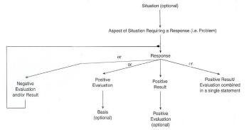 In this model, the description of the situation is optional. After referring to the response, the actual response may be positively and negatively evaluated. If there is a positive evaluation, there may possibly be three functional parts composed of the permutation of result and evaluation, mutually excluding each other: (1) positive result (e.g. The machine was operating.) followed by an optional positive evaluation (such as This really worked.), (2) a positive result and the evaluation combined in one single sentence (as in Now they are all academics. with reference to an educator teaching problematic students) or (3) a positive evaluation followed by the basis of evaluation, for instance testing the solution against the backdrops of the situation pictured in the text. The optional recycling, on the other hand, is triggered by the negative evaluation of the solution as shown in Figure 2.1. In this case, a new response is found and the cycle is repeated from response.