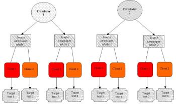 It is expected that when translators do their assignments, they will keep the characteristics of the websites, the clients’, i.e. the parties’, expectations and the websites’ respective readerships in mind, and that this will guide them when envisaging the skopos of the translated texts. In sum, the translation assignment contains the following scenario: two articles reflecting two different and opposing political standpoints are translated by two translators, whose political commitments oppose each other, for two clients, i.e. two opposing political parties. This will give altogether 8 target texts: two translators (Translators 1 and 2) receive two source newspaper articles (Kompenzáció published in Népszabadság and Másnap published in Magyar Nemzet) to be translated for two different clients, MSZP (Client 1) and Fidesz (Client 2). The components of the translation assignment are visualised in Figure 7.1.