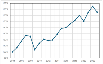 10.1. ábra. Az ipari termelés volumenindexe Magyarországon 2004 és 2023 között (%, 2004 = 100%)