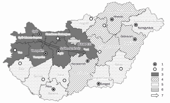Jelmagyarázat: 1 – nagyváros; 2 – vármegyeszékhely; 3 – integrált vármegyék; 4 – újraiparosodó vármegyék; 5 – periférikus vármegyék; 6 – szolgáltatásalapú centrumtérség; 7 – a kiegészítő újraiparosodási folyamatok fő iránya.