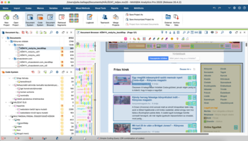 A MAXQDA szoftver igen változatos formátumokban rögzített, illetve tárolt adatok elemzésére alkalmas, így a kutatói korpusz tárolásának a formátumát az anyag, valamint a kutatási kérdések jellegéhez igazítva választottam meg. A vizsgálati mintát tartalmazó weblapokat 2021 január–februárjában pdf-formátumban archiváltam a Safari internetes böngészőprogramból exportált fájlként. Ez azért bizonyult ideális választásnak, mert így a weblapokat az interneten elérhető eredeti megjelenítésüket megőrizve tudtam elemezni, azaz a beépülő megnyilatkozások és paratextusok az eredeti vizuális megjelenítésükben, eredeti pozíciójukban, az eredeti modalitásukat megőrizve váltak elemezhetővé. A szoftver elemzési felületét az 3. kép szemlélteti: ezen a képernyőfotón a jobb oldalt található, legnagyobb terület maga az elemzés felülete, itt látható az aktuálisan elemzett weblap (jelen esetben a moly.hu kezdőlapja). A képernyő bal oldalán elhelyezkedő felső ablakban a korpusz összetétele látható, innen érhetőek el a projekt részét képező dokumentumok, vagyis a konkrét pdf-formátumban archivált weblapok. Végül a képernyő bal alsó ablakában az általam kialakított elemzési szempontrendszer egy része látható, azaz a létrehozott és kiosztott elemző címkéknek és szempontoknak, az úgynevezett kódoknak a rendszere.