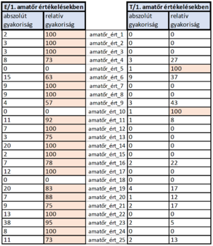 1 A táblázat forrása: saját szerkesztés. A táblázat színes kiemelései a minimum 50%-os relatív gyakoriságot jelzik. Azokban az esetekben, ahol egy adott értékelés tekintetében az E/1. és a T/1. személyjelölések relatív gyakoriságai összeadva kevesebb mint 100%-ot kapunk, ott értelemszerűen nemcsak első, hanem második személyt jelölő deiktikus konstrukciók is előfordultak, amelyek gyakorisági adatait viszont nem tünteti fel a táblázat.