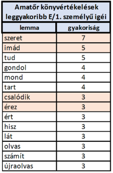 A táblázat kiemelései arra hívják fel a figyelmet, hogy az amatőr értékelések leggyakoribb E/1. személyű igei szerkezetei közül több az érzelem tágabb fogalmi keretét aktiválta: ilyenek voltak a leggyakoribb szeret (7), imád (5), továbbá csalódik (3) és érez (3) igék. Ez pedig összhangban áll azzal a 10.3.1.2. részben ismertetett sajátossággal, hogy az amatőr könyvértékelésekben jellemző volt a pozitív, illetve negatív érzelmi viszonyulást kifejtő diszkurzív egységeknek a szerepeltetése – gyakran a narratíva részeként. Mindezek alapján tehát úgy tűnik, hogy az amatőr könyvértékelések perszonális narratívái esetében a perszonalizáció mintázatai és az érzelem kognitív tartományának az aktiválása viszonylag jellemző együttállást mutatott. Ugyanakkor fontos azt is hangsúlyozni, hogy ezen együttállás tipikalitásának a megállapítása további empirikus kutatásokat igényel (vö. Péter 1991). A 23. táblázat pedig mindemellett azt is megmutatja, hogy a többi leggyakoribb E/1. személyű ige – a professzionális értékelésekhez hasonlóan (lásd 12.3.1.2.) – a gondolkodás, képesség, valamint a mondás és az ehhez szorosan kapcsolódó megértés fogalmi tartományait hozták működésbe.