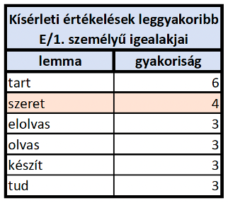 A leggyakoribbak azonban természetesen itt is az igealakon megvalósuló személyjelölések voltak. A 27. táblázat a kísérleti értékelések E/1. szerkezeteiben leggyakrabban előforduló igei lemmákat ismerteti.