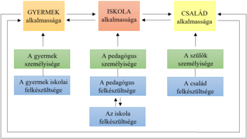 Az alkalmazkodás folyamatát számos háttértényező befolyásolja. A gyermek iskolai alkalmassága mellett fontos, hogy az iskola is megteremtse a feltételeket a különféle készségekkel, személyiséggel, családi háttérrel bíró gyermekek számára. Mindemellett a családnak is iskolaalkalmassá kell válnia, hogy hatékony támogatást tudjon nyújtani. A három dimenzió (7.1. ábra), azaz a gyermek, az iskola és a család kölcsönhatásban vannak egymással, ezért amikor a gyermek iskolaalkalmasságáról beszélünk, nem hagyhatók el az iskola és a család alkalmasságának tényezői sem. A három dimenzió mindegyike további két aldimenzióra bontható: a személyiség és a felkészültség aldimenzióira.