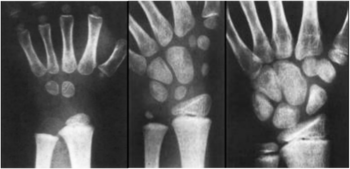 9.1. ábra. A porcos elemek csontosodási folyamata: 1. év, 2. év, 12. év