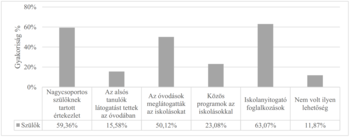 A válaszadó szülők (N = 1213) nyilatkoztak arról, milyen programokon vettek részt az iskolára készülve, akár gyermekeikkel közösen. Az iskolanyitogató foglalkozásokon vettek részt a legtöbben (63 százalék). A szülők több, mint fele vett részt nagycsoportosok szüleinek tartott értekezleten, ahol a tanítók ismertették az iskola elvárásait. A válaszadók gyermekeinek fele látogatott el iskolába a csoportjával (13.2. ábra).