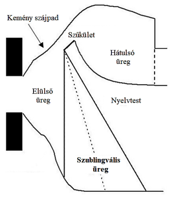Az 1.2.5.2.2. fejezetben bemutatott koartikulációs hatás következményeképpen a szibiláns képzésében érintett nyelvi régiót, azaz például az apikalitás-predorzalitás kontrasztját is vizsgálhatjuk a frikatíva után következő magánhangzó formánsfrekvencia értékein keresztül, pontosabban a szibilánst követő vokalikus fázis kezdetén mért F3-értékkel. Az F3 értéke a COG-hez hasonlóan szoros összefüggésben áll a frikatívák képzésekor gerjesztett elülső üreg nagyságával, mégpedig úgy, hogy minél nagyobb a szűkület előtti tér, annál alacsonyabb az F3 értéke (Dart 1991). Abban az esetben, ha retroflex beszédhangokról beszélünk – amely képzési jegy a kínai obstruensek egy csoportjára jellemző – az elülső üreg mellett még egy járulékos szublingvális üreggel is számolnunk kell (Hamann 2003), amely üreg alatt a szájüreg azon részét értjük, melyet alulról a szájfenék, felülről a nyelv határol (Zhang et al. 2005: 893). A retroflex beszédhangok képzésekor létrejövő elülső üreget kiegészítő szublingvális üreget a 11. ábra mutatja be. Ezt a szublingvális üreget az elülső üreg kiterjesztéseként, megnagyobbításaként is értelmezhetjük (Toda et al. 2010: 352). A fentiek értelmében tehát a retroflex posztalveoláris szegmentumok esetében a nagyobb elülső üregek (elülső üreg és annak szublingvális üregi kiterjesztése) miatt alacsonyabb F3-értékeket tapasztalunk, mint a dentálisoknál/dentialveolárisoknál (Toda et al. 2010).