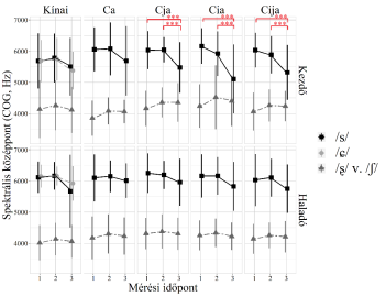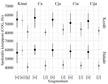 A kínai és magyar szibilánsok produkcióját a három mérési pontban (azaz a frikatív fázis időtartamának 20, 50 és 80%-ánál) mérve a magyarok két csoportjában külön-külön statisztikai modellel hasonlítottam össze. A kezdő és haladó nyelvtanulók mindkét csoportjának esetében a COG értékére a hangsor és a mérési időpont független változók interakcióban hatottak (kezdő: F(20, 1809) = 5,6; p < 0,001; haladó: F(20, 1830) = 1,7; p < 0,001) (49. ábra). A kezdő és haladó nyelvtanulók egyező mintát mutattak a magyar és kínai szibilánsok produkciójában: a kínai /s/ megvalósulását a magyar /s/ különböző kontextusú megvalósulásaival összevetve csak az elsőévesek esetében, a /sjaː/, /siaː/ és /sijaː/ kontextusok mérési pontjai között találtam eltérést. Ez azt jelenti, hogy csak ez utóbbiak ejtésének időtartama alatt változott jelentősen a COG értéke, a kínai és magyar /sa/, valamint a kínai /ɕa/ és /ʂa/ esetében nem. A haladók esetében nem találtam szignifikáns eltérést a mérési időpontok között egyik kontextus esetében sem, illetve a kontextusok között sem. A kínai dentialveoláris /s/ megvalósulásában mért COG minden ponton egyezett a magyar /saː/, /sjaː/, /siaː/ és /sijaː/ hangsorok szibilánsaiban mértekkel. Ugyanígy a COG szerint a kínai alveolopalatális /ɕ/ szibiláns ejtése kontextustól függetlenül minden mérési ponton egybeesett a magyar dentialveoláris /s/ ejtésével mindkét csoport esetében. A kínai kváziretroflex /ʂ/ és a magyar posztalveoláris /ʃ/ különböző kontextusú realizációinak összehasonlításakor sem találtam szignifikáns eltérést egyik csoportnál és egyik mérési ponton sem (49. ábra). Mindezek alapján tehát a magyar beszélők egyik csoportja sem különítette el produkciójában a kínai /ʂ/-t a magyar /ʃ/-től, valamint a kínai /s/ és /ɕ/ is egyezett a magyar /s/ ejtésével a COG értékek tekintetében.