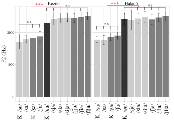 51. ábra: A magyar és kínai szibilánsokat követő vokalikus szegmentum kezdetén mért F2-érték átlaga és szórása a különböző kontextusok esetében (az adott hangsor előtti K jelzés az x-tengelyen a kínai /a/-kontextusú hangsorokat jelöli, ahol ilyen jelzés nem áll, a magyar hangsorok adatait látjuk /aː/, /jaː/, /iaː/ és /ijaː/ kontextusokban) (Szignifikanciaszintek: *: p < 0,05; **: p < 0,01; ***: p < 0,001; n.s. (fekete színnel jelölve): nem szignifikáns eltérés)