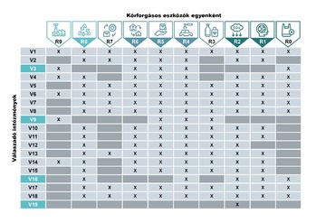 Az 1. ábra áttekintő összegzése annak, hogy a válaszadó intézmények mely körforgásos eszközöket alkalmazzák. Az ábrán x-szel jelöltük a használatot, színezéssel annak hiányát. Pozitívan jelöltük az eszközhasználatot minden esetben, ha a megkérdezett legalább egy példát tudott említeni az adott körforgásos módszerhez kapcsolódóan.