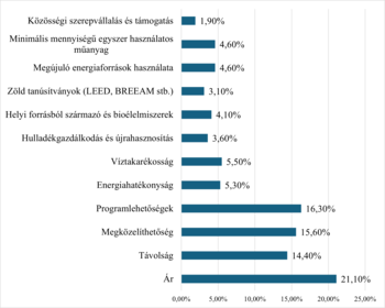 A kutatásba bevont személyek szállásválasztási lehetőségeit az 1. ábra mutatja be; az olyan kulcsfontosságú tényezőkre összpontosítva, mint a megfelelő ár/érték-arány, a programlehetőségek, a megközelíthetőség és a távolság. Annak ellenére, hogy a vendégek többsége nem feltétlenül volt tisztában a fenntarthatósági törekvésekkel választott szálláshelyén, jelentős részük aktívan részt vesz a fenntartható gyakorlatokban.
