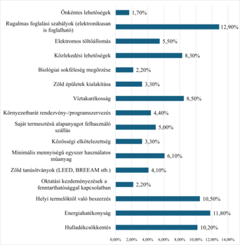A 2. ábrán látható, hogy a rugalmas foglalási feltételek vonzó tulajdonságként jelennek meg, és a válaszadók körében az egyik legkedveltebb fenntarthatósági gyakorlatként szerepelnek. Az energiahatékonyság, a víztakarékosság, a hulladékcsökkentés is jelentős figyelmet kapnak. Nem elhanyagolható szempont a rövid ellátási beszerzési lánc, a helyi termelőktől való beszerzés és a műanyaghasználat visszaszorítása sem.