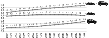 Ugyanazon autótípus mérete is növekszik új típusváltozat esetén: a személygépkocsik által elfoglalt városi terek arányát az a tény is növeli, hogy az autógyártók ugyanazon modell újabb verzióinak méretét minden alkalommal néhány centiméterrel megnövelik. Ez az egyes verzióváltások esetén szinte észrevehetetlen méretnövekedés több évtized távlatában már 30-40 cm növekedést eredményez (2.1. táblázat), ami bőven elegendő ahhoz, hogy gyalogosként egyre kisebbnek érezzük a rendelkezésünkre álló városi tereket.