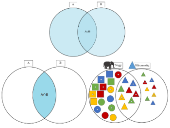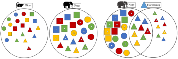A 6.3.4. ábra bal oldalán levők, idegen (diszjunkt) halmazok, egyetlen olyan elemük sincs, amelyik mindkét tulajdonsággal rendelkezik, ugyanis vagy csak kicsik, vagy csak nagyok. Ezzel az ábrával előkészíthetjük az összeadás fogalmát, ami nem más, mint két diszjunkt halmaz egyesítése. A 6.3.4. ábra jobb oldala erre nem használható. Ebben az esetben találunk olyan elemeket, amelyek a két halmaz tulajdonságaival rendelkeznek, azaz nagy is és háromszög is.