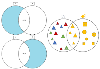 Halmazok különbségébe A\B esetén olyan elemek kerülnek, amelyek elemei az A-nak, de nem elemei B-nek.6 Például ha A = háromszög és B = sárga, akkor A\B → háromszög, de nem sárga; vagy B\A → sárga, de nem háromszög (6.3.3. ábra). A\B = {x | x ∈ A de x ∉ B}; B\A = {x | x ∈ B de x ∉ A}.