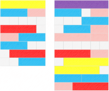 Az egyik legismertebb játék a készlettel a „szőnyegezés” (6.3.7. ábra). Például a lila rudat rakjuk ki sokféleképpen (szőnyegezzük). Ezt a játékot versenyszerűen is lehet alkalmazni, ki talál több megoldást. Ellenőrzése: az egyik óvodás felolvassa az első kirakott sort (fehér, meg, világoskék, meg rózsaszín). Azt a sort kihúzzuk. A különböző sorrendben kirakott, de azonos elemek különbözőnek számítanak. A természetes szám fogalmának kialakítása ezen eszköz segítségével játékosan megoldható.