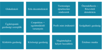 • a magántulajdon helyett hozzáférés (bizonyos erőforrásokat, termékeket vagy szolgáltatásokat nem kizárólagos tulajdonként, hanem inkább hozzáférési jogként kezelünk. Ez azt jelenti, hogy az embereknek nem kell saját tulajdonként birtokolniuk például autót, lakást vagy egyéb eszközöket, mert hozzáférnek azokhoz szükség szerint, például a megosztó (sharing) vagy közösen használt rendszereken keresztül. Ez a szemlélet támogatja a fenntarthatóságot és a hatékony erőforrás-gazdálkodást, mivel csökkenti a tulajdonlás szükségességét, és inkább a közös használatra, megosztásra helyezi a hangsúlyt);