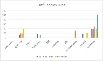 The consecutively interpreted TL texts of Luna are characterized by repetitions, false starts and grammar errors (Figure 10.6). In her spontaneous speech, repetitions, grammar errors and restarts are the most frequent disfluencies. In her extemporaneous speech, only repetitions were found.
