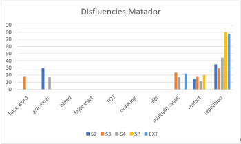 Figure 10.7 Disfluencies in the TL texts and in the spontaneous and extemporaneous speech of student Matador