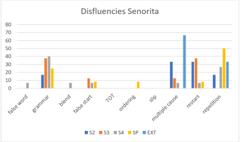 Figure 10.8 Disfluencies in the TL texts and in the spontaneous and extemporaneous speech of student Senorita