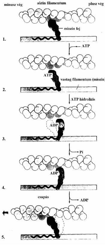 A fejről leválik az ADP is, ismét meggyengül a miozin és az aktin kötődése, és kezdődik egy újabb ciklus.