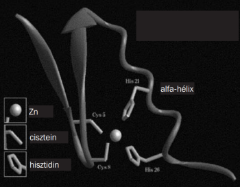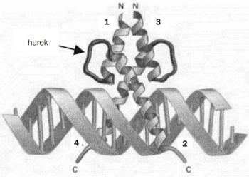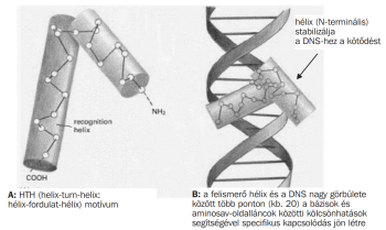 Génreguláló fehérjék. Mindezek a szabályozó génszekvenciák semmit nem érnek a hozzájuk kötődő, rajtuk keresztül a transzkripciót szabályozó génreguláló fehérjék nélkül. Génreguláló fehérjéknek nevezik azokat a fehérjéket, amelyek a géneket ki-bekapcsolják, illetve működésüket befolyásolják. Az eukarióta sejtek mindegyike egy adott, a sejttípusra jellemző génreguláló „fehérjekészlettel” rendelkezik. A génreguláló fehérjék általában a DNS nagy görbületének szélét ismerik fel. A motívumokban a bázissorrend a nagy görbület területén a bázisok eltérő atomcsoportjai miatt olyan egyedi mintázatot hoz létre, amelyet csak egy adott génreguláló fehérje ismer fel és kötődik hozzá (III.20. ábra).