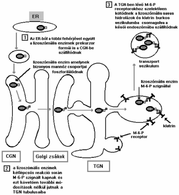 Szállítás más sejtalkotókba: az endoszomális és lizoszomális kompartmentbe történő szortírozás és szállítás a legjobban ismert útvonal. Mint láttuk már a CGN-ben megtörténik a lizoszomális enzimek elkülönítése és a M-6-P szignál kialakítása. Ezek a fehérjék azután további módosítások nélkül áthaladnak a Golgi-zsákokon és a M-6-P receptorokhoz kapcsolódva, a receptorok segítségével olyan transzport vezikulumokba csomagolódnak a TGN-ben, amelyek lefűződve az endoszomális kompartment egyik elemével a késői endoszómával fúzionálnak, és így jutnak el a lizoszomális kompartmentbe (V.3. ábra).