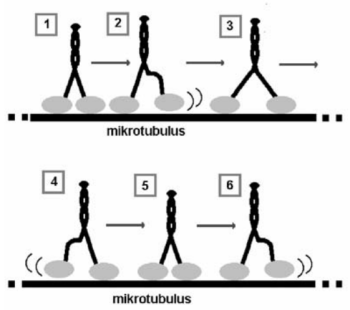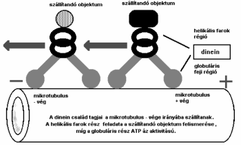 A második csoportban az ún. motor fehérjéket találjuk. A motor fehérjék két nagy családját ismerjük: a kinezineket és a citoplazmatikus dineineket. A kinezin szupercsalád fehérjéi azok, amelyek a mirotubulus + vége felé mozgatják az organellumokat, ezért + vég motornak is hívják őket. Úgy tűnik, hogy a különböző kinezin molekulák organellum illetve transzport specifikus megoszlást mutatnak a sejtekben, azaz más és más kinezin található a különböző transzport rendszerekben. Ugyanez elmondható a másik fontos mikrotubulus motor fehérjéről, a dineinről is. Eddig három citoplazmatikus dineint írtak le, amelyek eltérő sejten belüli elhelyezkedést mutatnak. Ez a legfontosabb – vég motor, amely az organellumokat a – vég irányába mozgatja.