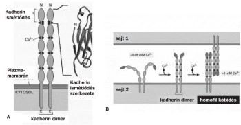 A legtöbb kadherin a plazmamembránt egyszer átérő glikoprotein, amelynek a sejten kívüli térbe nyúló része öt hasonló domént tartalmaz, közülük három, illetve négy Ca2+-ion kötőhely ezeket kadherin ismétlődéseknek (cadherin repeat) nevezzük. A Ca2+-ion az ismétlődő domének közé épül be és merevíti a molekula sejten kívüli térbe nyúló részeit. A molekula rövidebb, citoplazmába benyúló C terminális része a kateninek (α, β) és más kapcsoló fehérjék segítségével a sejtváz aktin filamentumaihoz horgonyzódik ki (XI.1. ábra). Ca2+-ionok hiányában a kadherin molekula szerkezete megváltozik, nem tudnak egymással dimereket képezni és a proteolítikus enzimek lebontják. A kadherinek által közvetített sejt–sejt kapcsolódás alapja az ún. homofil kötődés, azaz két egyforma molekula kapcsolódik egymással, és ez a kötődés a két sejtet is összekapcsolja. A két sejt kadherin molekuláinak plazmamembránból kinyúló részei úgy illeszkednek egymáshoz ebben a kapcsolódásban, mint ahogy a zipp-zár fogacskái kapcsolódnak össze (XI.1. ábra).