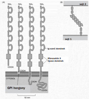 A molekula szerkezetére jellemző, hogy a sejten kívüli térbe hosszan kinyúló része tartalmazza az 5 db Ig molekulákra is jellemző „zsebecskét”, míg a sejten belüli térbe nyúló molekularész mérete igen változó lehet, az adhéziós fehérje funkciójától függően. Ezek a sejtadhéziós molekulák is fontos szerepet töltenek be az embrionális fejlődésben és akárcsak az N kadherin, az N CAM is megjelenik a kialakuló velőcső sejtjeinek membránjában és átmenetileg nagyon sok más típusú sejt membránjában is.