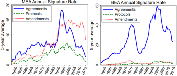 Figure 15. Rates of successfully completed IEA negotiations. Source: Mitchell, R. B., Andonova, L. B., Axelrod, M., Balsiger, J., Bernauer, T., Green, J. F., ... & Morin, J. F. (2020). What we know (and could know) about international environmental agreements. Global Environmental Politics, 20(1), 103-121. Multilateral IEAs (MEAs, open to three or more states) and bilateral ones (BEAs, limited to two states).