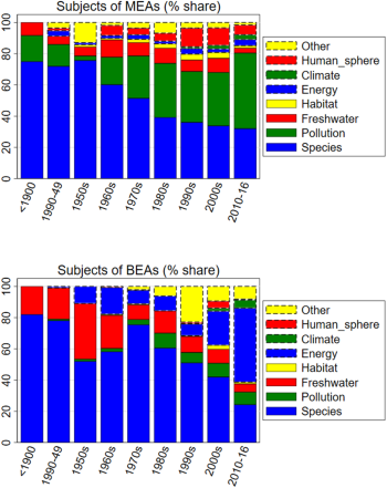Figure 16. Subject of MEAs; subject of BEAs. Source: Mitchell, R. B., Andonova, L. B., Axelrod, M., Balsiger, J., Bernauer, T., Green, J. F., ... & Morin, J. F. (2020). What we know (and could know) about international environmental agreements. Global Environmental Politics, 20(1), 103-121. Multilateral IEAs (MEAs, open to three or more states) and bilateral ones (BEAs, limited to two states).