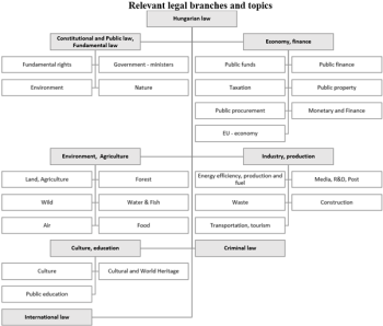 For the interpretation of sustainability1 in the Hungarian legal framework the systemisation follows the classical approach of branches of law. Therefore, within the Hungarian law, for sustainability the relevant branches can be employed and combined as the following: (i) constitutional law and fundamental law (fundamental rights, government – ministers, environment, nature); (ii) economy and finance (public funds, public finance, taxation, public property, public procurement, finance, EU economy); (iii) environment and agriculture (land, agriculture, forest, wild, water and fish, air, food); (iv) industry and production (energy efficiency, production and fuel, media, R+D, post, waste, construction, transportation, tourism); (v) culture, education (culture, cultural and world heritage, public education); (vi) criminal law; and (vii) international law.